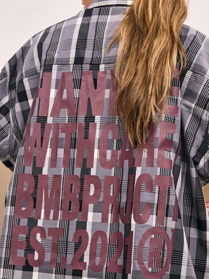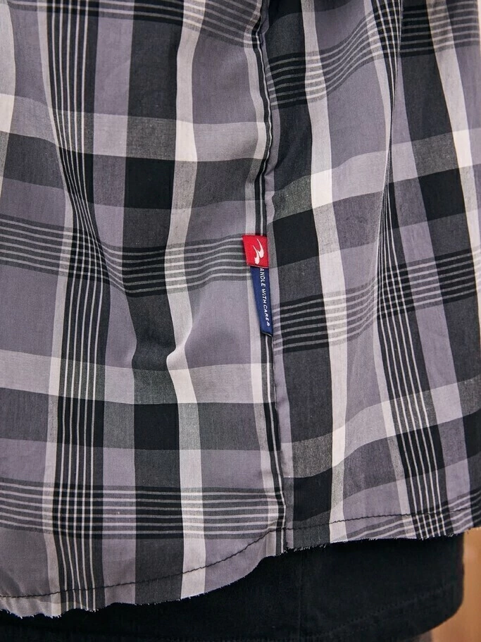 • Camisa a cuadros gris. Estampa en la espalda. Detalle de etiquetas marcarias tejidas en el lateral.